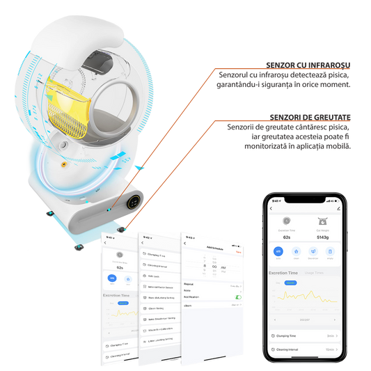 Litiera smart automata pentru pisici, sistem auto-curatare, sterilizare automata UV, aplicatie telefon
